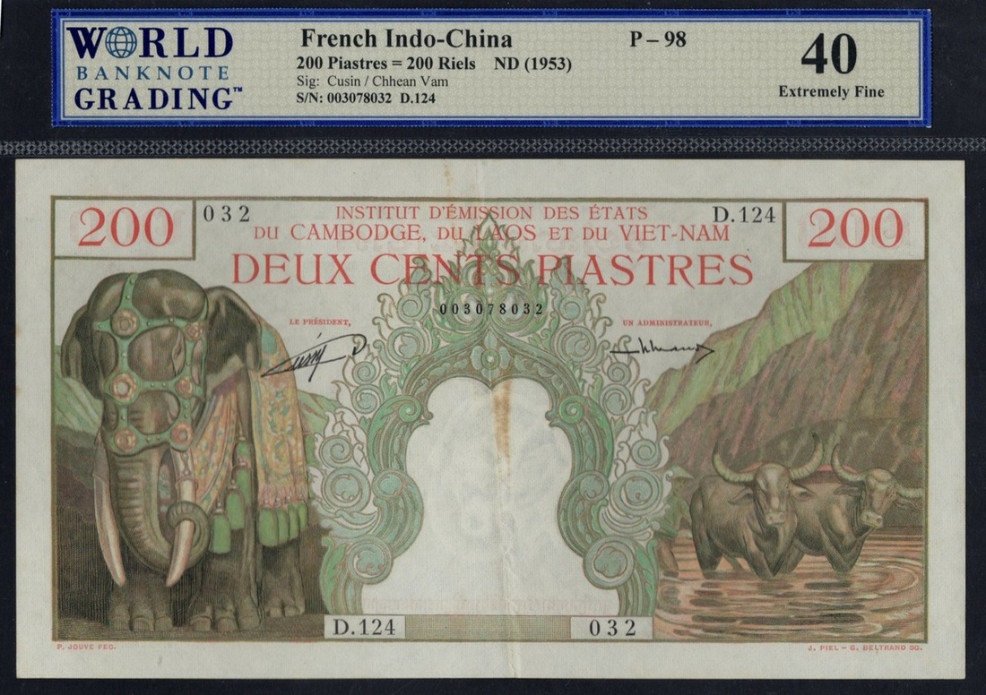 French Indo-China. Institut d'Emission des Etats du Cambodge, du Laos et du Vietnam. 200 Piastres - 200 Riels. ND (1953). P-98. No. 003078032 D.124. Green and brown. Elephant left, water buffalos right; Bayon Angkor head on back left, tree right. Stain at center. WBG Extremely Fine 40.