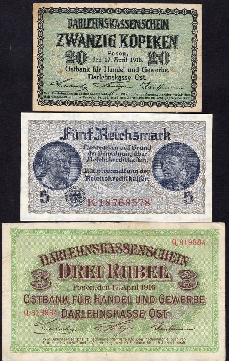 Germany. Imperial-Third Reich. Lot of Occupation and Military issues. Russian areas occupied during WWI - P-R120 (2), 121c, 122a, c, 123b, 131 (2); Occupied Territories WWII - P-R135 (2), 136 (2), 137a, 138 (4), 140; WWI Wehrmacht -P-M32 (4), 36, 38 (2), 39. VG-Uncirculated.
