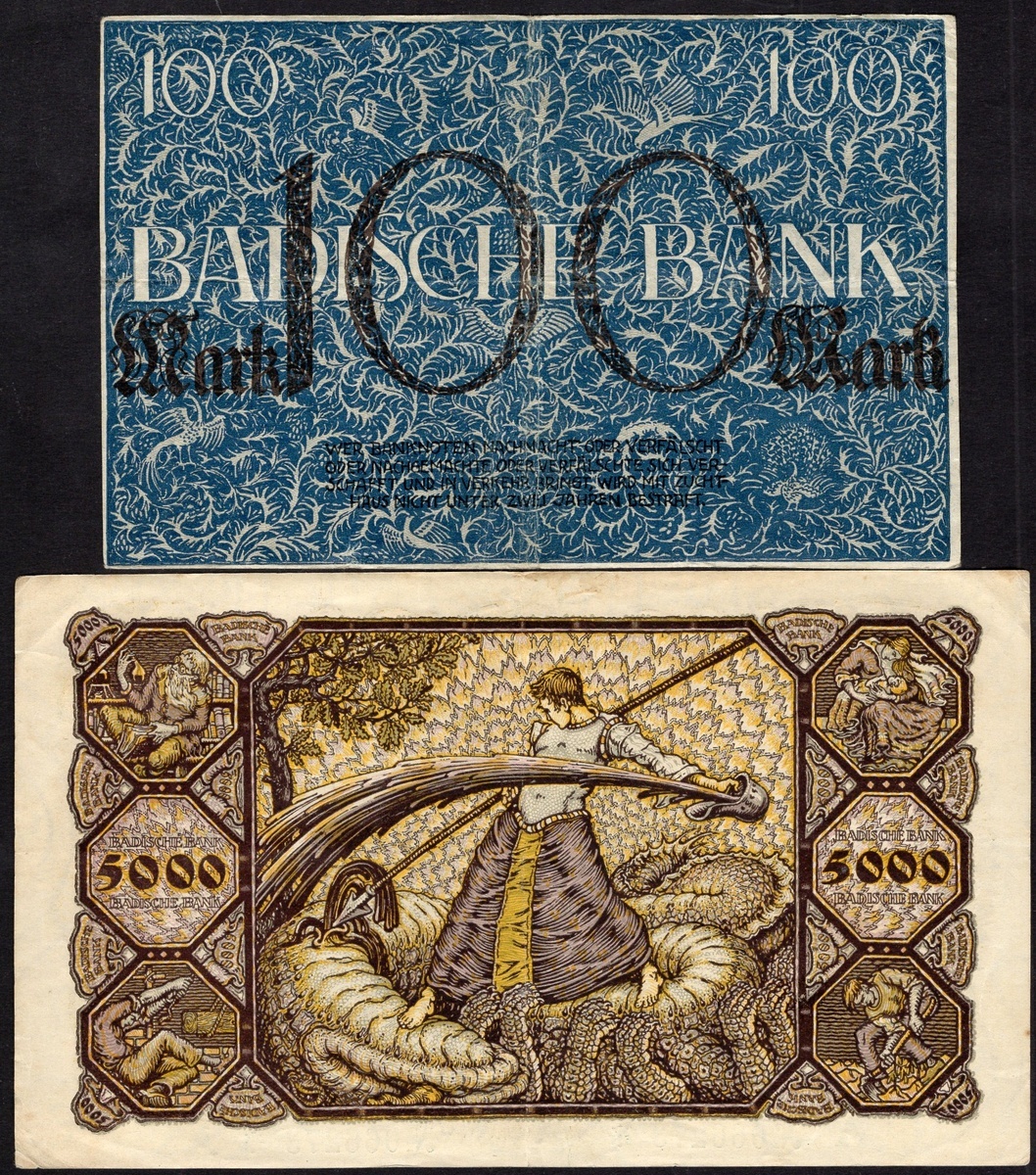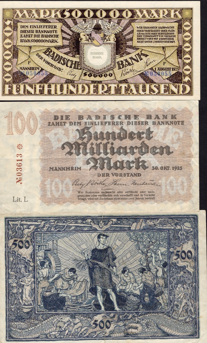 B>Germany Regional Banks. Badische Bank. Group. 100, 500 and 5,000 Mark. 1907. 1918-1922 issues. P-S907-909; 10,000 (2), 500,000 Mark, 1 Million (2) Mark, 2 and 100 Milliarden Mark. 1923 issue. P-S910-914. Fine+ to EF. [10]