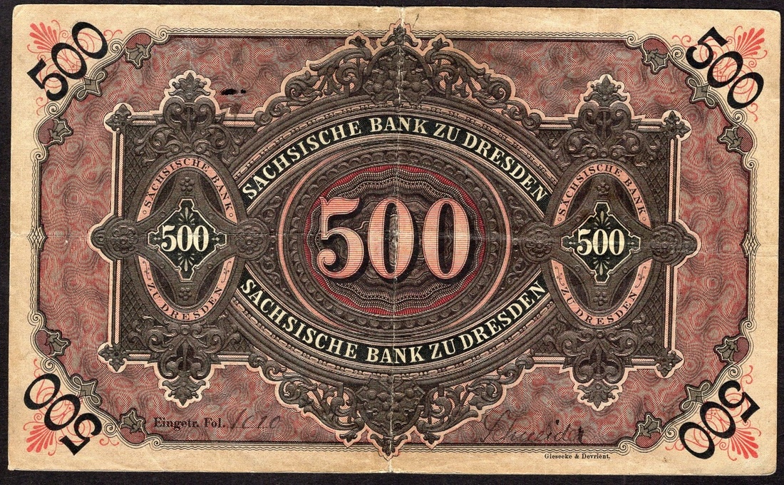 Germany Regional Banks. Sächsische Bank. 500 Mark. 1890. P-953a. Black on red-brown and green. Wreathed woman's portrait at left, Mercury at right. Fine+.