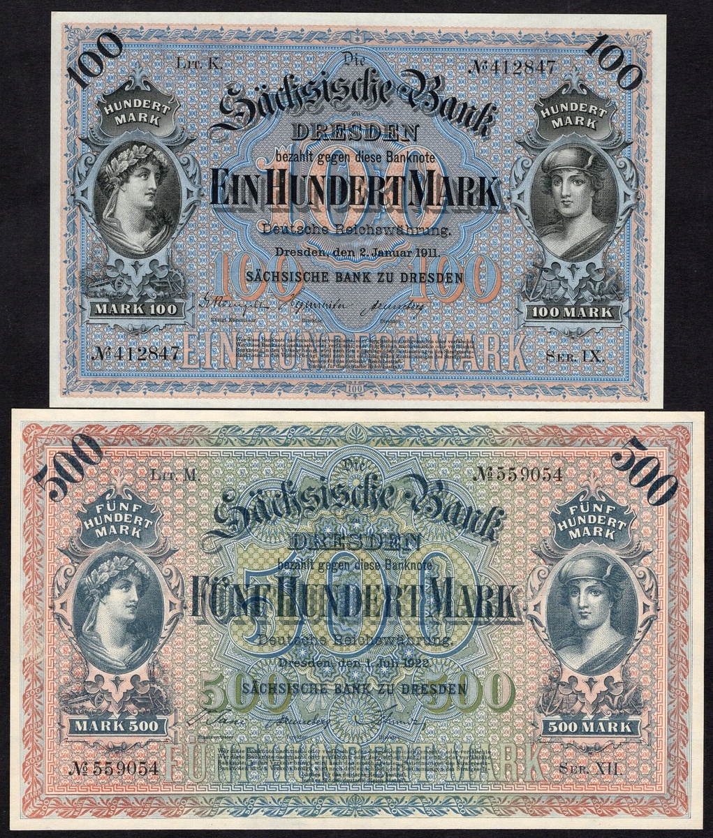 Germany Regional Banks. Sächsische Bank. 100 and 500 Mark. 1911. P-S952b. 953b. Wreathed woman's portrait at left, Mercury at right. Uncirculated. [2]