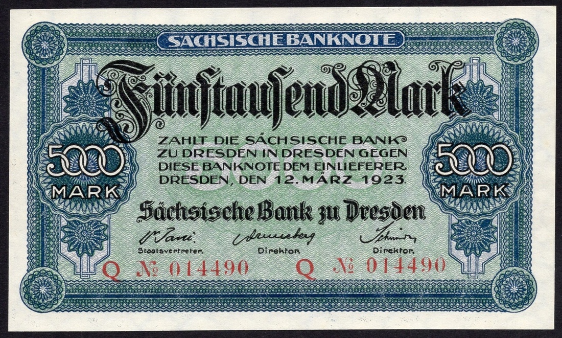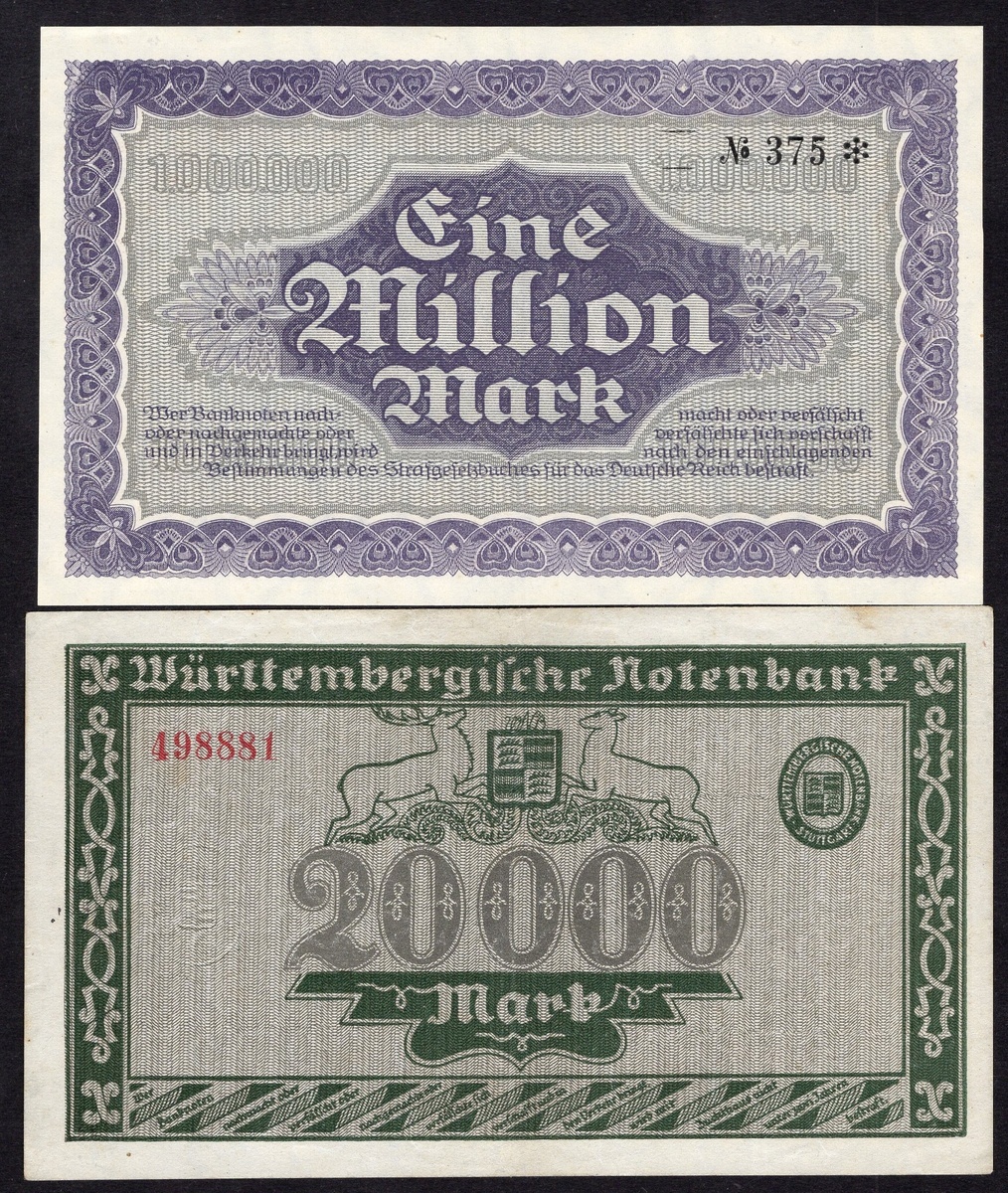 Germany Regional Banks. Lot. Sächsische Bank. 1923 issue - 5,000 (2), 10,000, 50,000, 100,000, 500,000 Mark, 1 Million (4), 2, 5 and 100 Millionen Mark. P-S957 to 965; Württemberische Notenbank. 1923, First issue - 10,000, 20,000 (small number penciled in margin), 50,000 and 100,000 Mark. P-S982 to 985. Fine+-Uncirculated. [17]