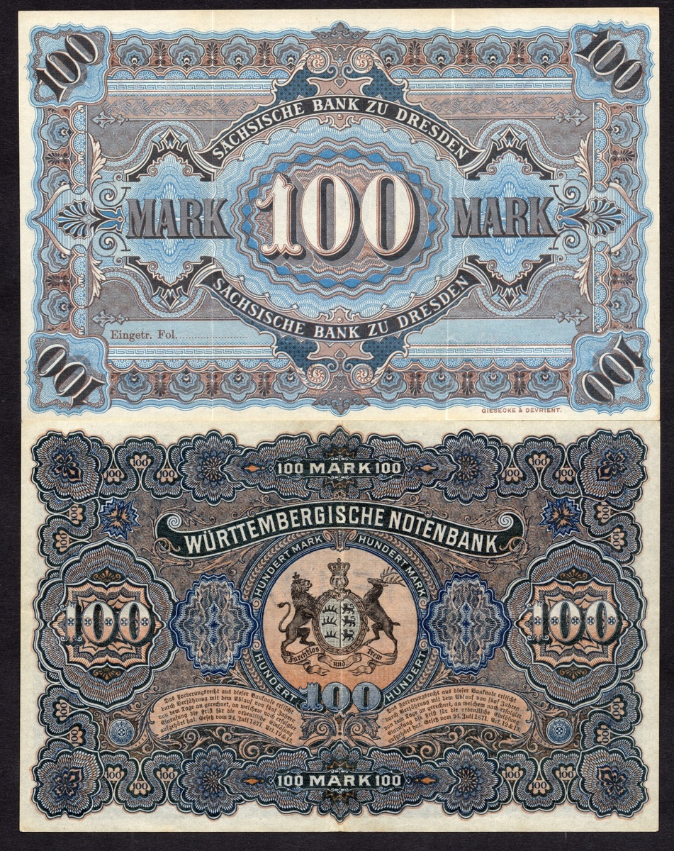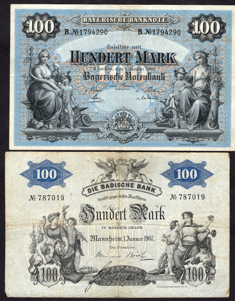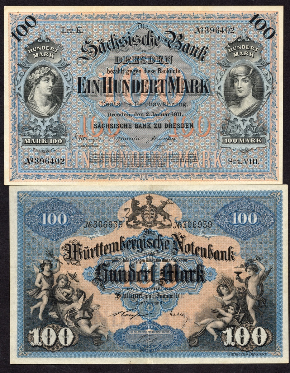 Quartet of German States 100 Mark notes: Badische Bank. 1907. P-S906a. Fine, cornertip bunched; Bayerische Notenbank. 1900. P-S922; Sachsische Bank. 1911. P-S952b; and Württembergische Notenbank. 1911. P-S979c. Very Fine. [4]