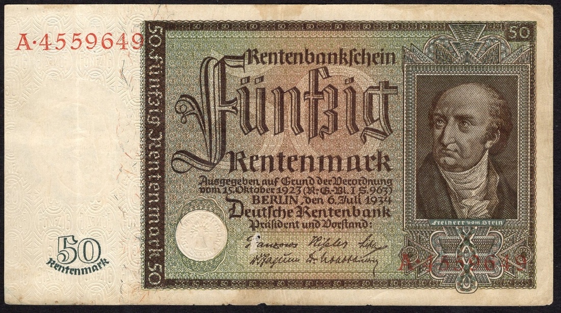 Germany. Weimar. Rentenbankschein. 50 Rentenmark. 1934. P-172. No. A 4559649. Dark brown on olive. Freiherr v. Stein portrait at right. Scarce. Tiny edge nick, light edge toning at center. About Very Fine.