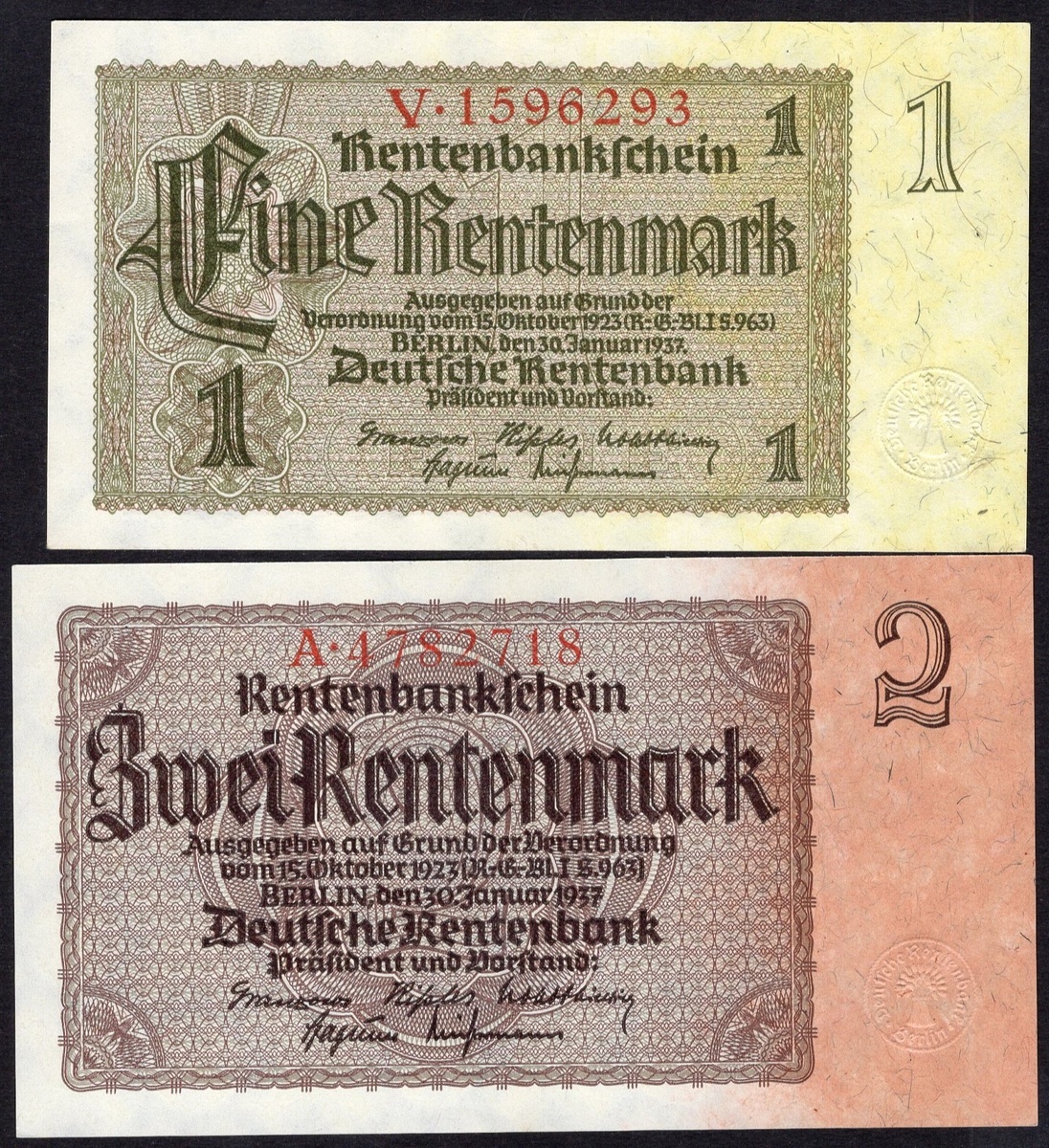 Germany. Weimar. Rentenbankschein. Scarce 1937 Pair: 1 and 2 Rentenmark. With 7 digit serial numbers. P-173a, 174a. Uncirculated. [2]