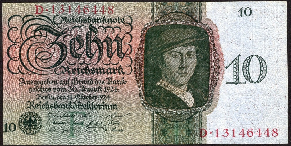 Germany. Weimar. Reichsbanknoten. 10 Reichsmark. 1924. P-175. No. D 13146448. Green and red-lilac. Portrait of the merchant Dietrich Born center right. Choice EF.