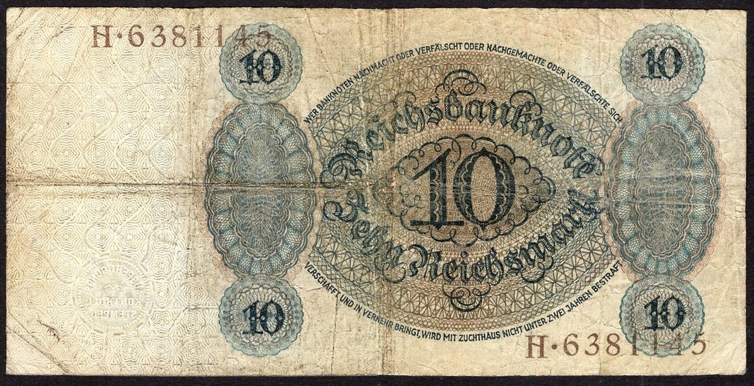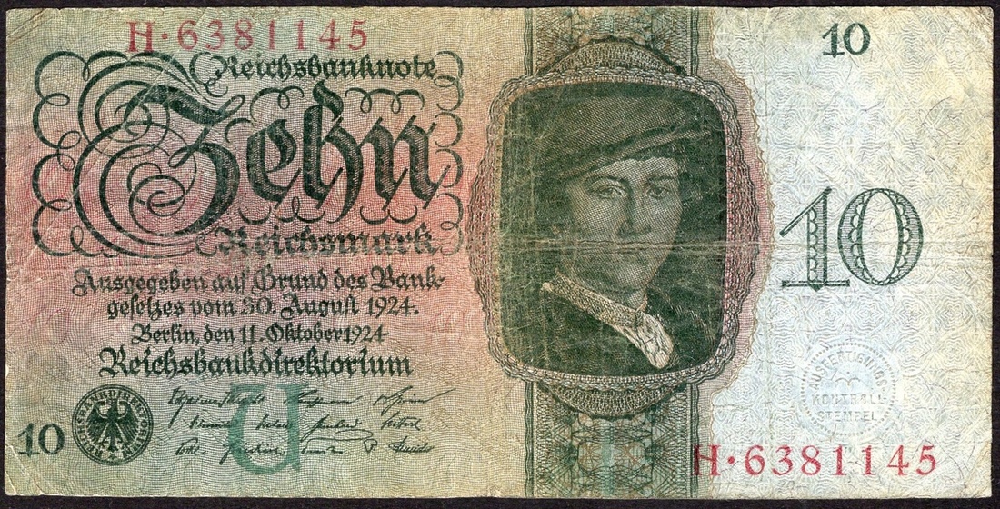 Germany. Weimar. Reichsbanknote. 10 Reichsmark. 1924. P-175. Holbein portrait of merchant Dietrich Born at center right. Scarce note. Some soiling. Fine.