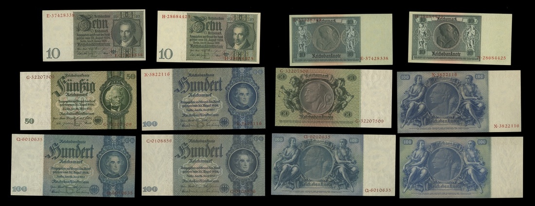 Germany. Weimar-Third Reich. Reichsbanknote 1929-1936, (1945) Issues Grouping. 10 Reichsmark. P-180a (2), b; 20 Reichsmark. P-181a, b; 50 Reichsmark. P-182a (2), b; 100 Reichsmark. P-183a (2), b. Uncirculated. [11]