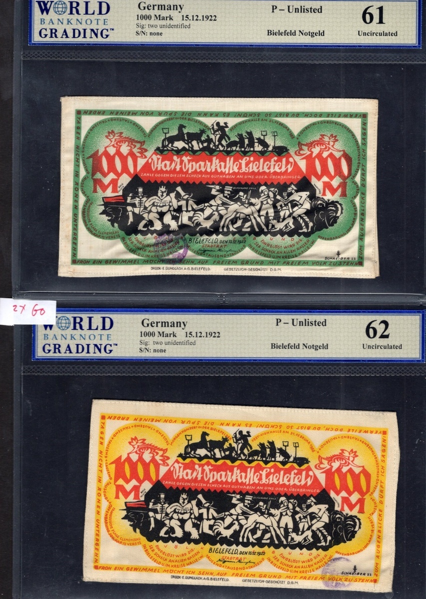 Germany. Pair of Bielefeld Notgeld 1000 Mark notes. Linen. Green, black and red. Silhouette conducter with animal orchestra top center, mayhem scene below; Versailles caricature silhouette scene. Purple handstamp. WBG Uncirculated 61; Silk. Yellow, black and red. Purple handstamp. WBG Uncirculated 62. [2]