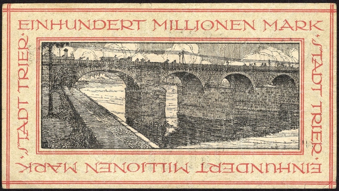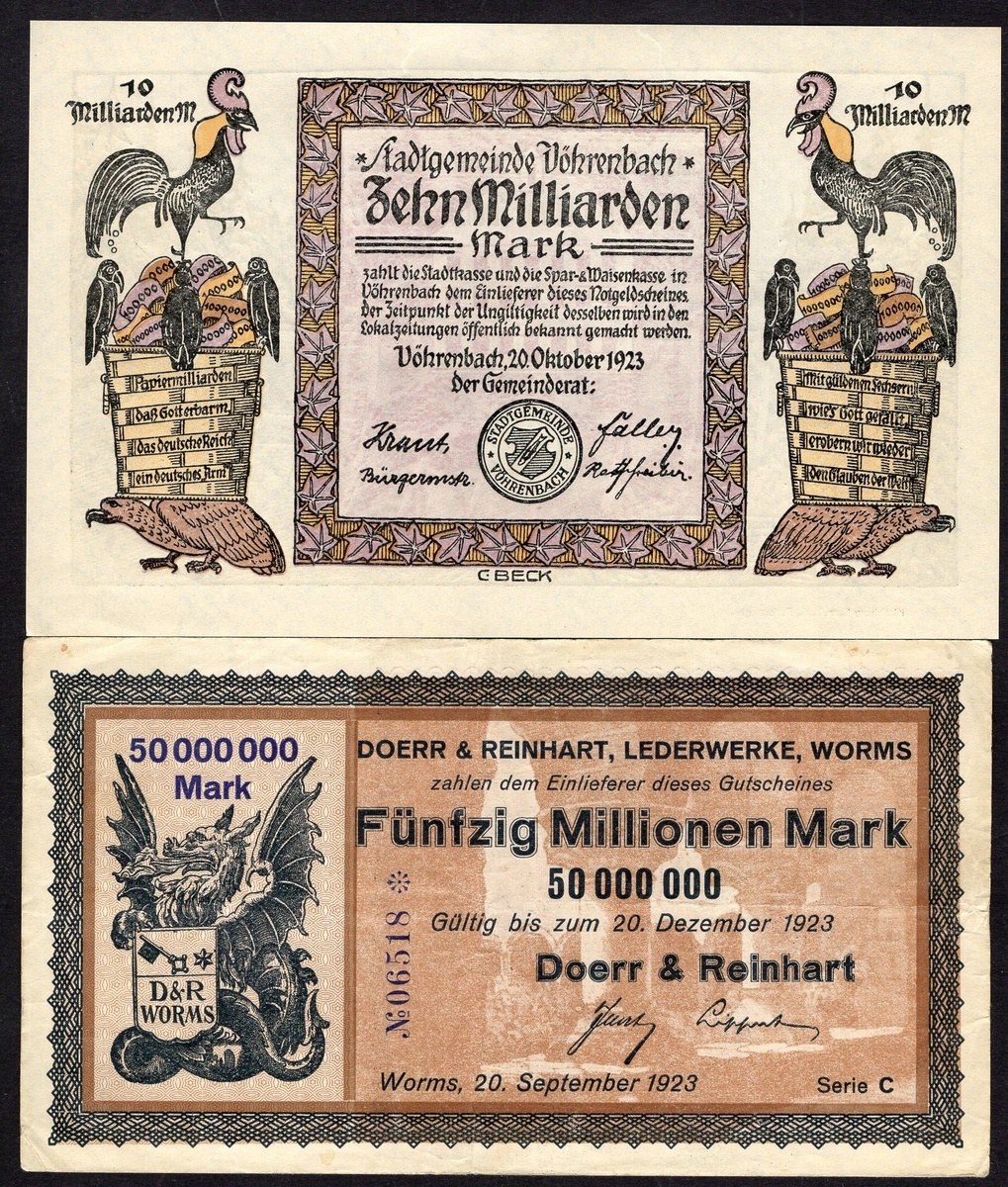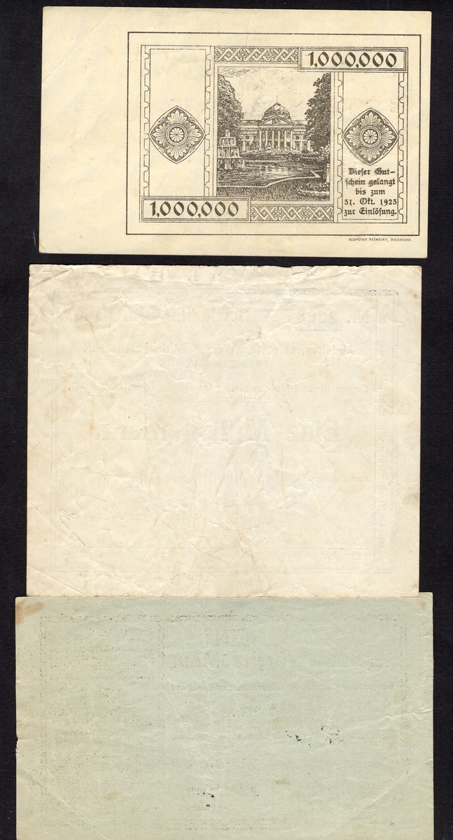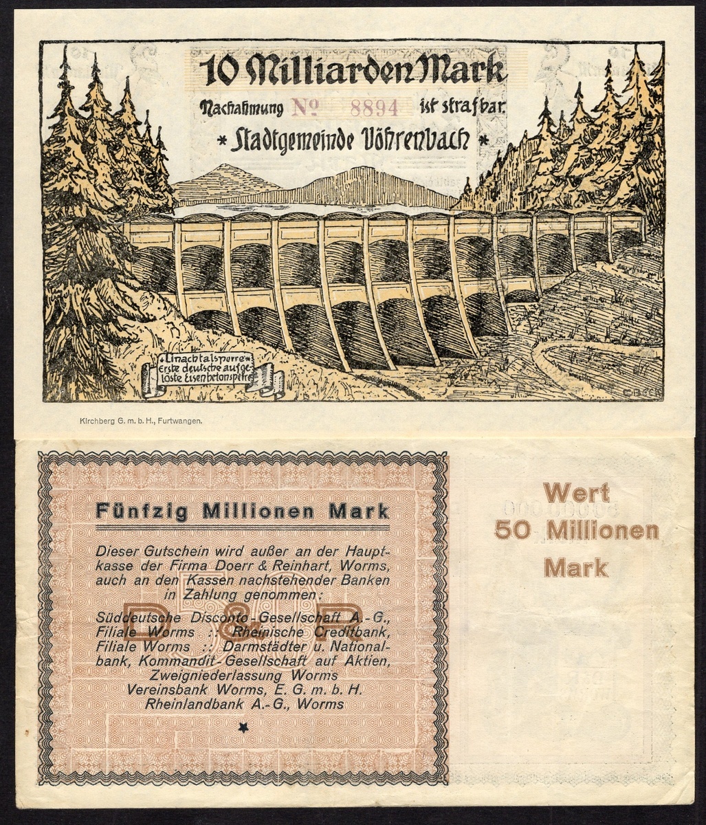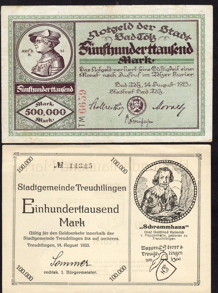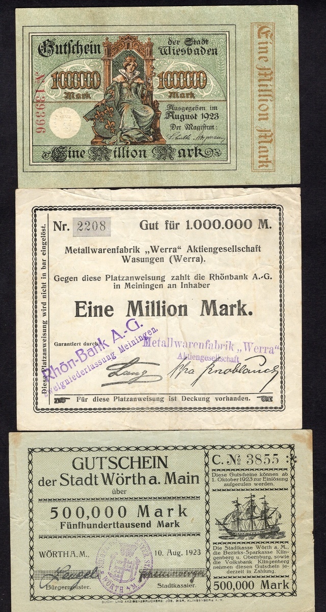 Germany. Collection of 1923 Inflation Municipal Emergency Notes, Tailfingen-Zwiesel. Tailfingen, Tecklenberg, Thüringen (24), Tiengen (4), Todtnau, Bad Tolz (2), Traunstein (9), Treuchtlingen (2), Treuchtlingen-Weissenburg, Triberg, Trier (16), Triftern, Trossingen, Tübingen, Überlingen (2), Uelzen (7), Uerdingen, Uffenheim-Windsheim, Untersachsenberg, Untertauns (Langenschwalbach, 3), Urach (4), Vaihingen, Vöhrenbach (2), Viersen (3), Vilseck (4), Voerde, Vohwinkel (5), Voithenberg, Wachtendonk, Waiblingen (2), Wald (6), Waldenburg (7), Waldkirche (3), Waldsassen (4), Waldsee (6), Waldshut (2), Wandsbek, Wangen, Wanne (2), Wasserburg (3), Wasungen, Wattenscheid (2), Wehr, Weide (2), Weiden (7), Weilbach, Weilburg (4), Weilheim (4), Weimar (5), Weingarten (8), Weinheim (4), Weinsberg (2), Weissenburg (7), Weissenhorn, Welzheim, Werdau (2), Westerburg, Wertheim (2), Westfalen (15), Wetter (2), Wetzlar (12), Wiesbaden (6), Wiesdorf (2), Wildingen (5), Willich (2), Wilsdruff (3), Wimpfen (3), Wipperfürth, Witten (3), Wittenberg, Wittlich (4), Bad Wörishofen (2), Wörth (2), Wolfach (4), Wolfen (2), Worms (8), Wülfrath, Würzburg (2), Wurzbach (13), Wurzach (2), Zeiskam, Zell, Zella-Mehlis (2), Ziegenhain (2), Zirndorf, Zittau, Zoppol, Zoppot (2), Zschopau (4), Zweibrücken (4), Zwenkau, Zwickau (5), Zwiesel. Good variety of issues, some Rare. About Fine-EF. Should be Viewed.