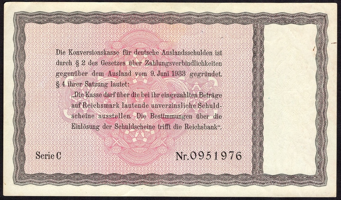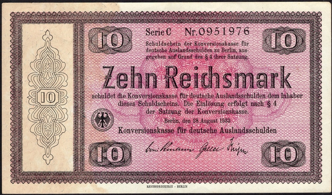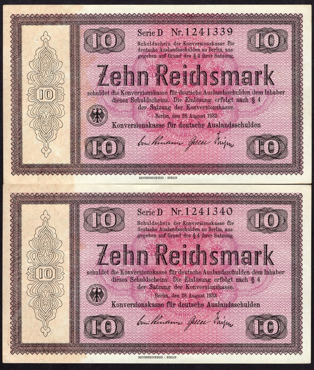 Germany. Third Reich. Conversion Fund for German Foreign Debts. 10 Reichsmark (3). 1933. P-200. Black and lilac. Two with stapleholes in margin. Good VF. [3]