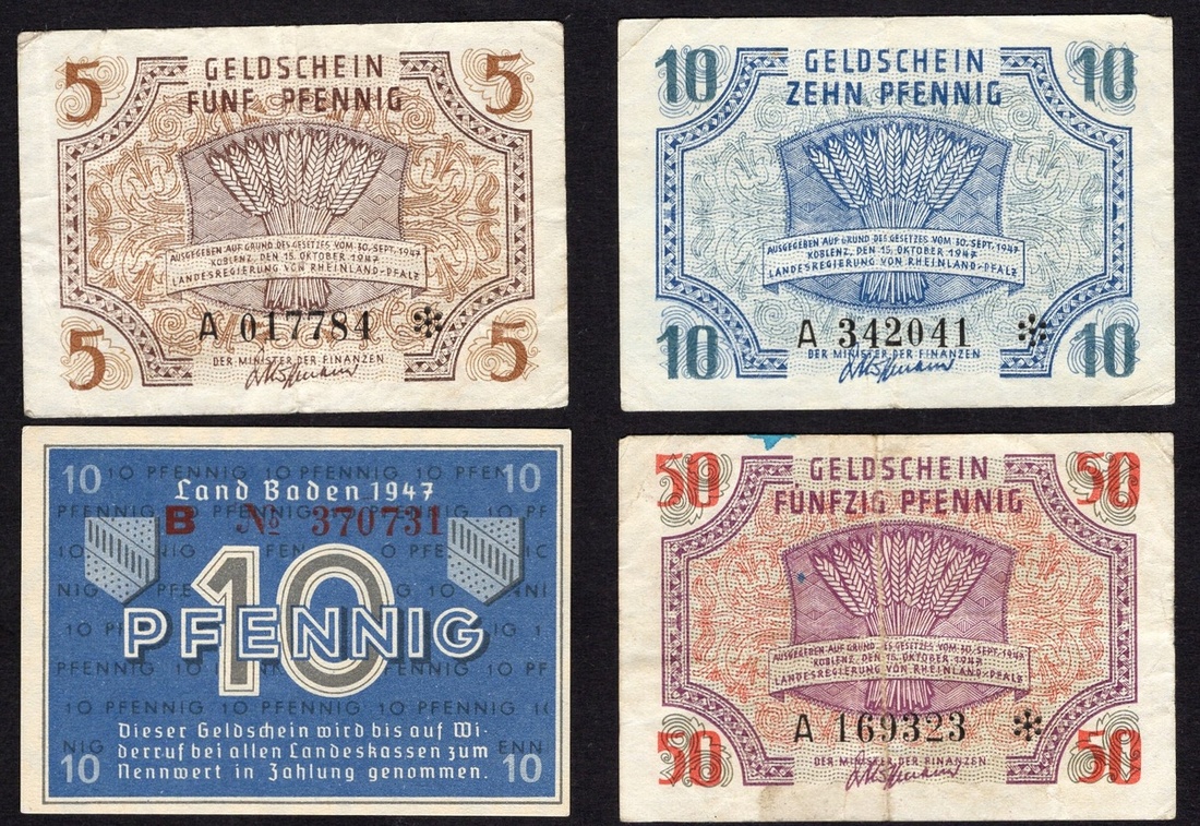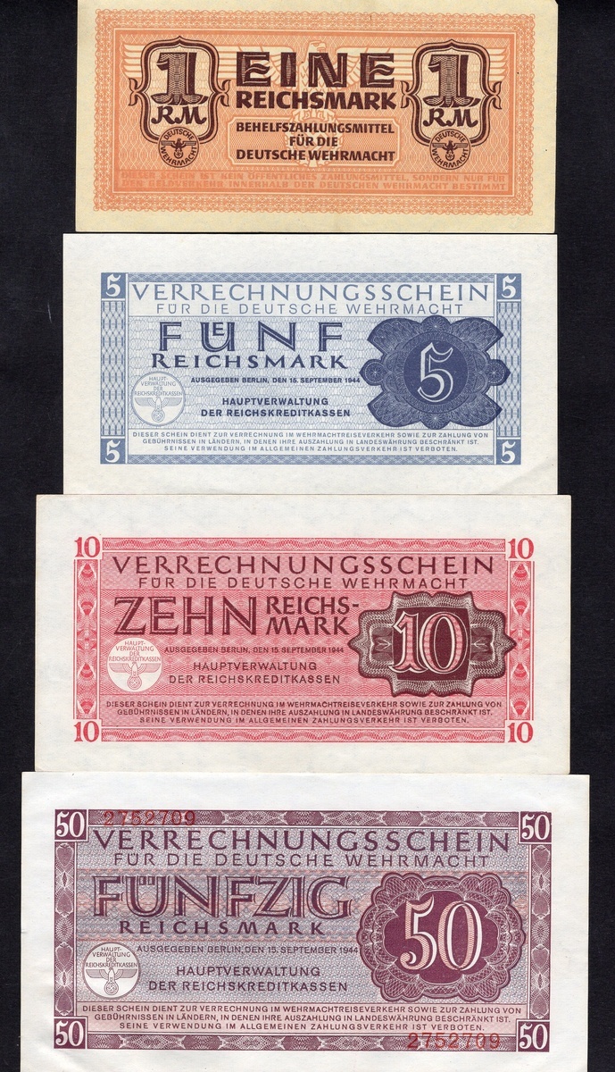 Germany. Third Reich. Military Payment Certificates. Wehrmacht. Quartet of notes: 1 Reichsmark. ND (1942). P-M36. Tiny cornertip fold, 5 10 and 50 Reichsmark. 1944. P-M39-41. EF-AU; also Post WWII. French Zone, 1947. Baden. 10 Pfennig. P-S100a. Unc; and Rheinland-Pfalz. 5, 10 and Pfennig. P-S1004-1006. First two VF, latter Fine. [8]