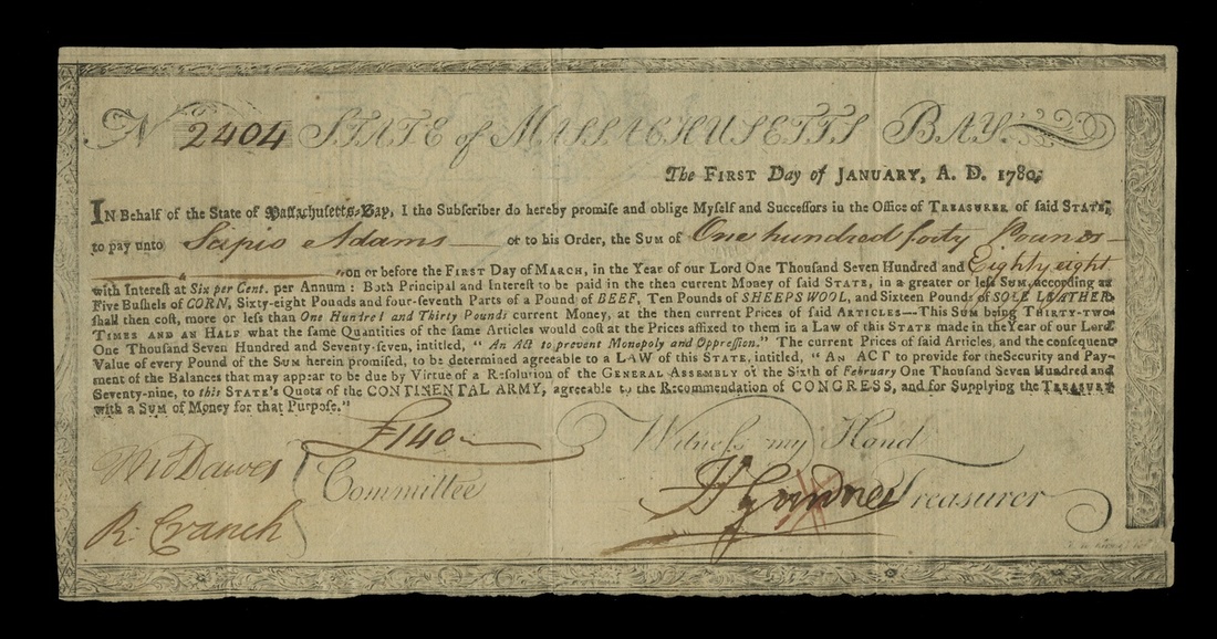 Massachusetts Bay. Commodity Bond. January 1, 1780. One-Hundred Forty Pounds. No. 2404. Anderson MA-21-V. J.M. Furnass's name is below flourish instead of inside. Pencil notations on reverse. Very Fine.