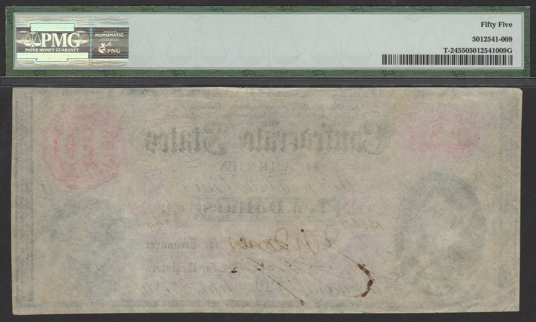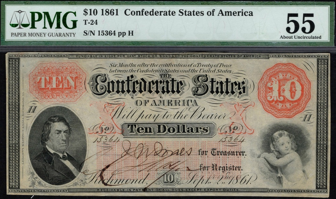 CSA. T-24. $10. Sept. 2, 1861. Cr.156. PF-1. No. 15364, plate H. Hunter portrait at left, vignette of Rev. Dr. Alfred L. Elwin as a child lower right. Leggett, Keatinge & Ball. Good color. PMG About Uncirculated 55. Ex NASCA Auction 66, September 1987, lot 531.