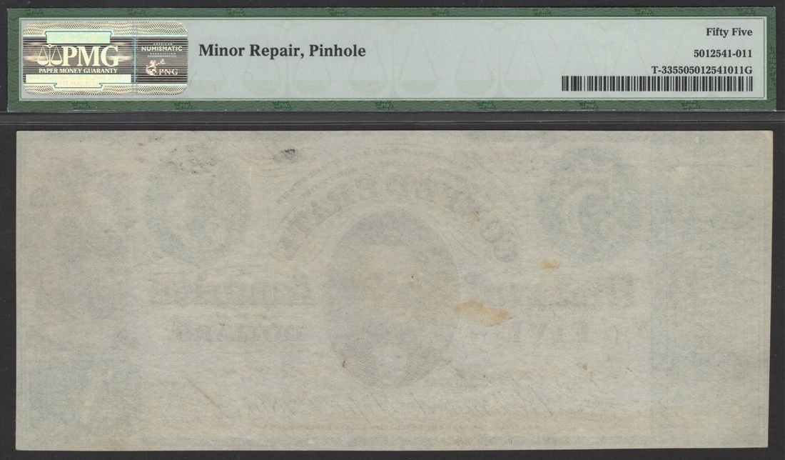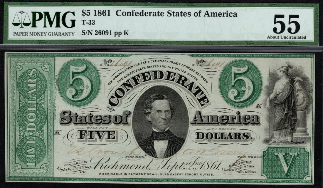 CSA. T-33. $5. Sept. 2, 1861. Cr.254Ba. PF-7. No. 26091, plate K. Memminger at center, Minerva right. Keatinge & Ball at left, only partial "V", no "A" (for VA). PMG About Uncirculated 55, minor repair, pinhole. Ex NASCA Auction 66, September 1987, lot 593.