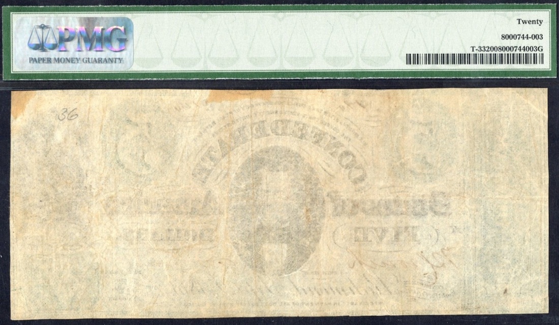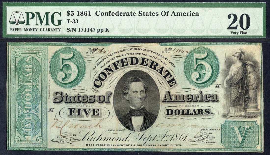 CSA. T-33. $5. Sept. 2, 1861. Cr.254Ca. PF-7. No. 171147, plate K. Memminger at center, Minerva right. Keatinge & Ball. PMG Very Fine 20. Quite scarce in grades better than Fine.