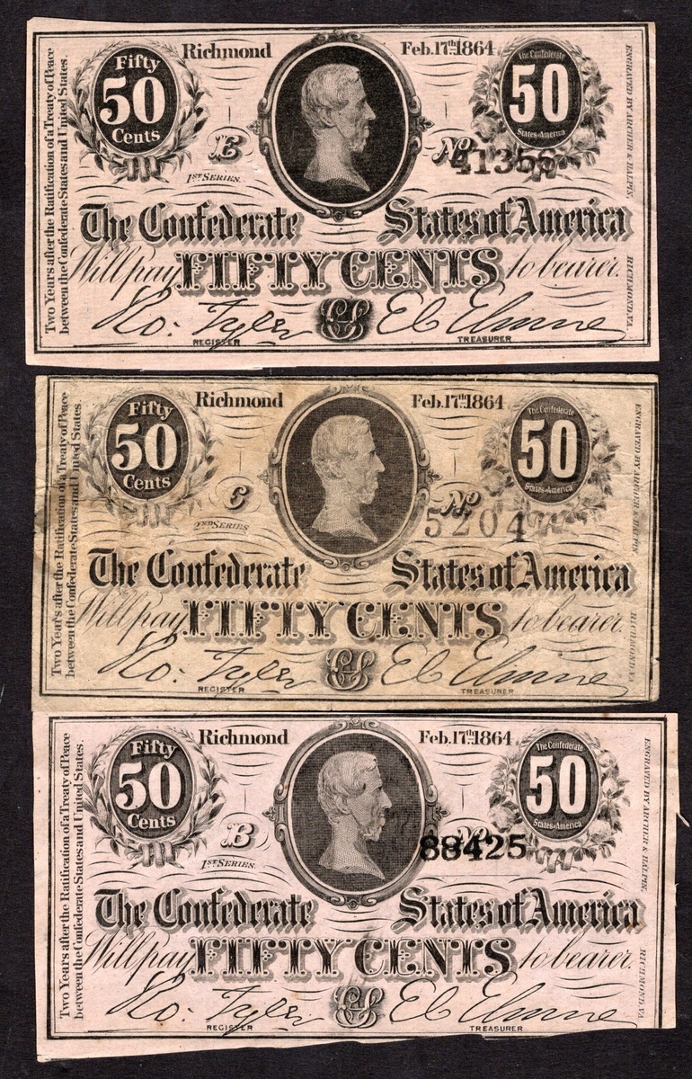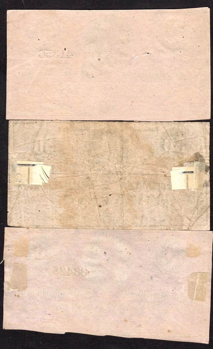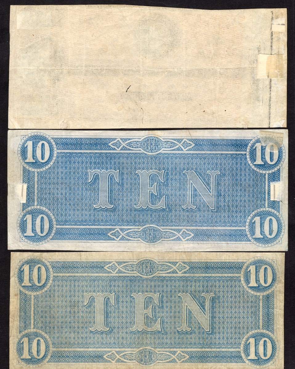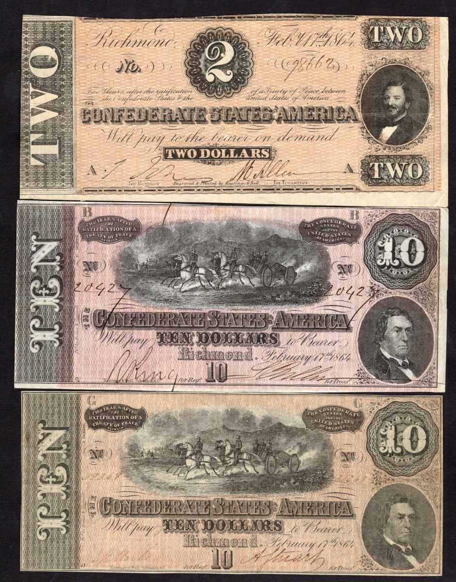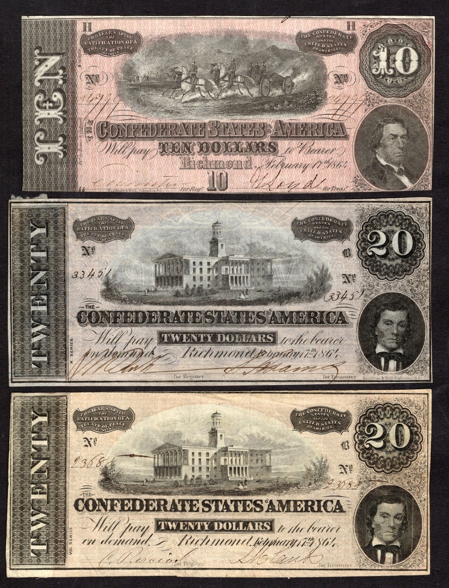 CSA. Lot of Seventh Series, Feb. 17, 1864 Notes. 50 Cents. T-72 (3). Davis. Two with hinge remnants; $1. T-71 (2). Clay. One with tape backing; $2. T-70. Benjamin; $10. T-68 (3). Horse pulling cannon, Hunter; and $20. T-67 (2). State capitol, Nashville, Stephens. Four without hinge remnants on back, the rest with. Fine-EF. [11]
