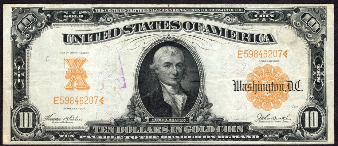 Fr. 1172. $10. Gold Certificate. 1907. Michael Hillegas, first U.S. Treasurer. Teehee-Burke. No. E59846207. Light ink block seal on front. Very Fine.