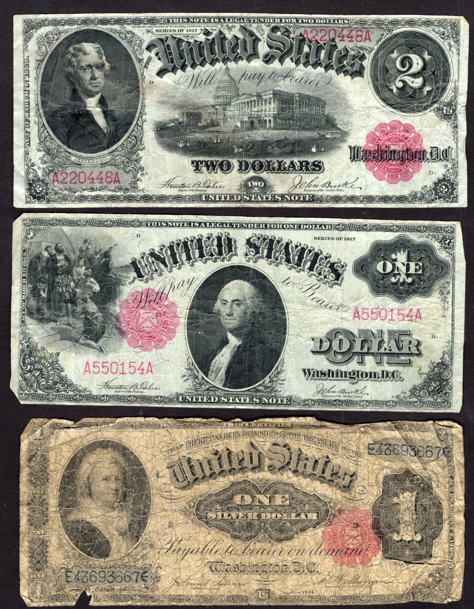 Trio of low-grade Large Size Notes: Fr.36, 57. $1 and $2. Legal Tender. 1917. Very Good; Fr. 223. $1. Silver Certificate. 1891. Fair. [3]