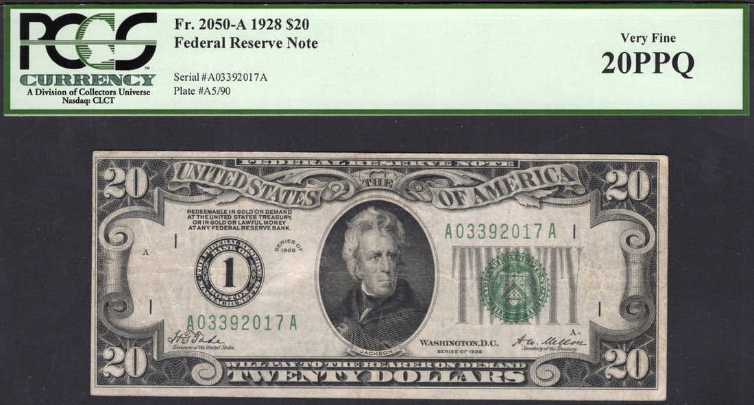 Fr. 2050-A. $20 Federal Reserve Note. 1928. Boston. Andrew Jackson. Tate-Mellon. No. A03392017A. PCGS Very Fine 20 PPQ.