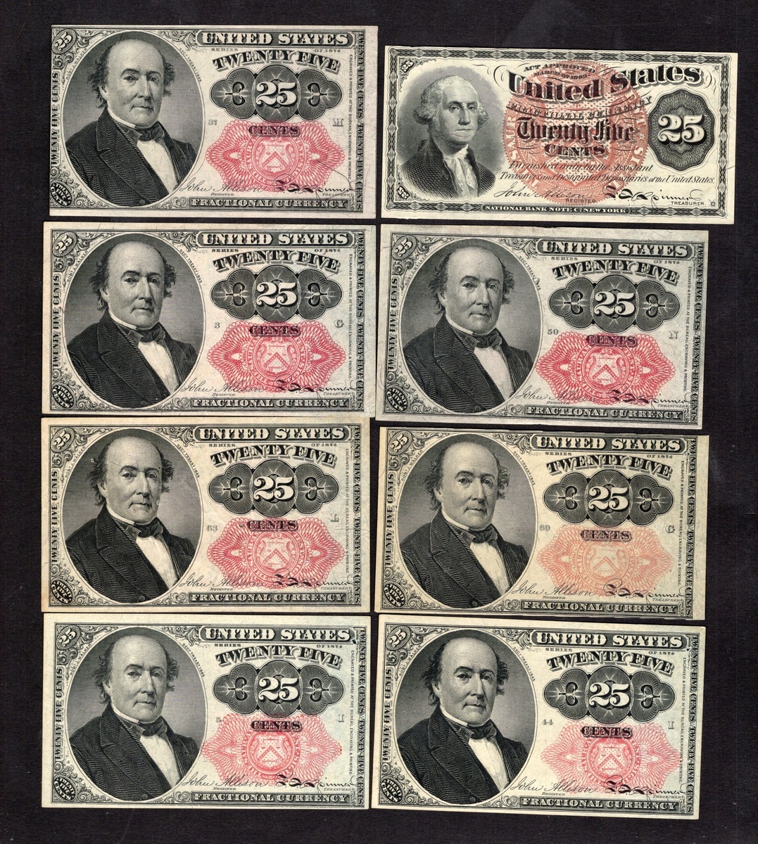 Lot of 25 Cents Notes. Fractional Currency. First issue. Fr. 1281 (3). Designs of five 5-cent stamps; Third issue. Fr. 1294 (2). Fesenden; Fourth issue. Fr. 1302 (3). Washington portrait at left; Fifth issue. Fr. 1308 (2), 1309 (5). Robert J. Walker. Generally, About VF-EF. [15]