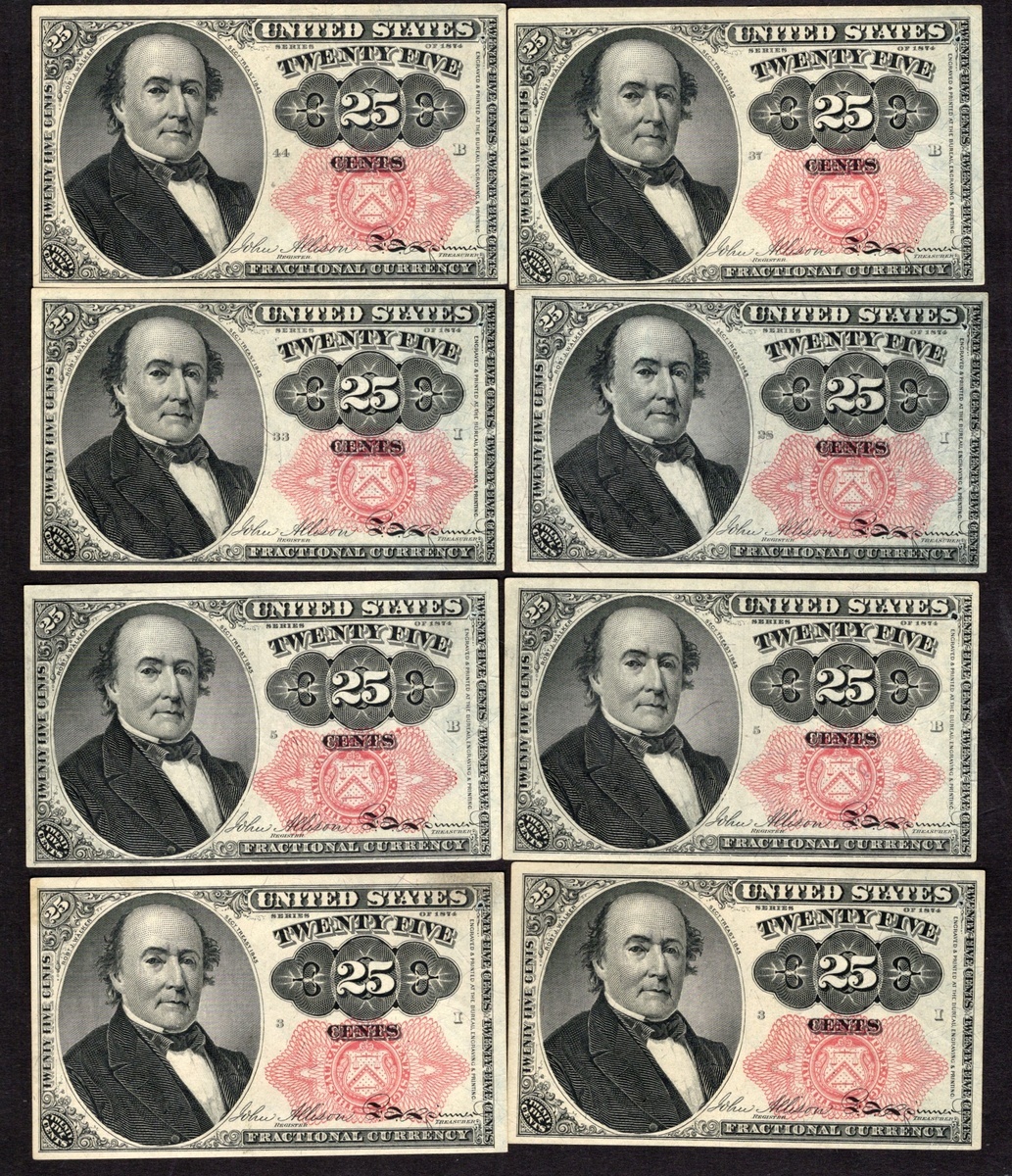 Lot of Fr.1308. 25 Cents Notes. Fractional Currency (17). Robert J. Walker bust at left, long, thin key in seal; also Fr. 1309. Short, thick key. EF-Uncirculated. [18]