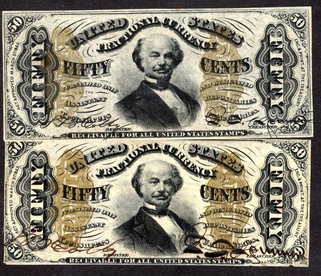 Fr.1324-SP and 1328-SP. Specimen 50 Cents Notes - Fronts. Fractional Currency. Gen. Spinner, U.S. Treasurer. Printed Colby-Spinner signatures, SPECIMEN in gold lower back, wide margins; and autographed Colby-Spinner signatures, narrow margins. AU. [2]