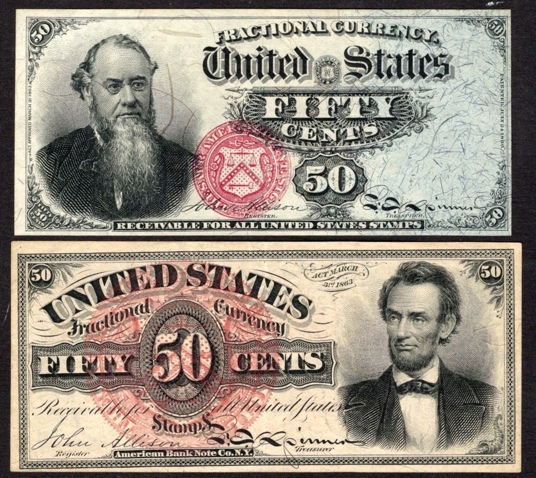Fr.1374, 1376. Fourth Issue pair of 50 Cents Notes. Fractional Currency. Lincoln; Secretary of War Edwin M. Stanton. VF and EF. [2]