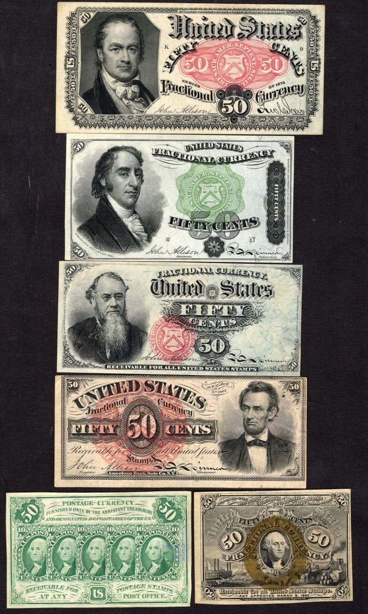Mix type group of 50 Cents Notes. Fractional Currency. Fr.1312, 1316, 1374, 1376, 1379, and 1380. First, Second, Fourth and Fifth Issues. Line of five 10-Cent stamps, Washington in oval frame, Lincoln, Stanton, Dexter, and Crawford. The Lincoln note some small spots on back, Fine+, the others About VF-About EF. [6]