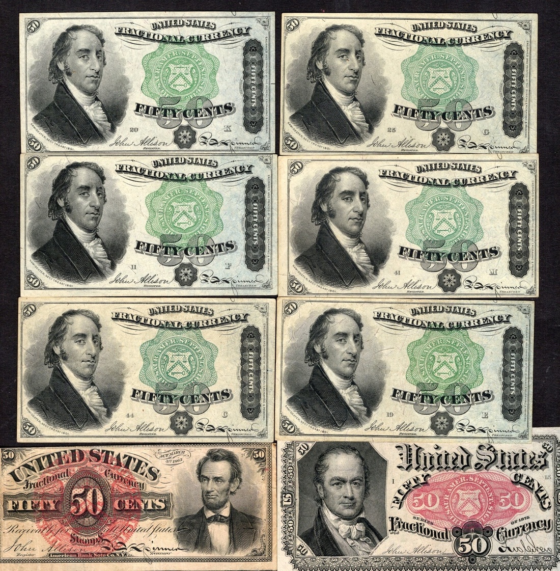 Lot of 50 Cents Notes. Fractional Currency. Fr. 1374, 1379 (6), 1380. Lincoln; Stanton; Crawford. The first Fine, the others Very Fine. [8]