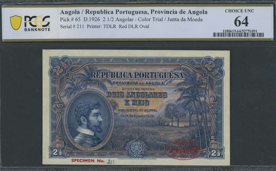 República Portuguesa, Província de Angola, *TOP POP* colour trial specimen 2 1/2 Angolares, 1926, serial number 211, (Pick 65cts), in PCGS holder 64 Choice Uncirculated, the single finest graded on PCGS census
