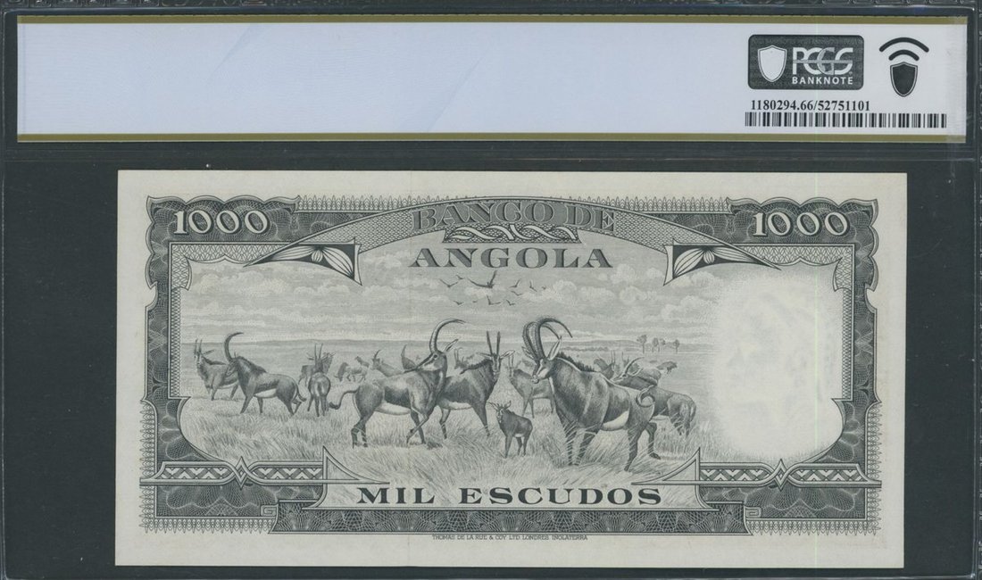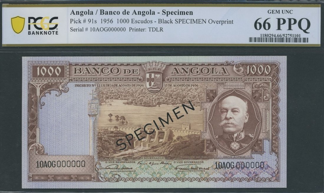 Banco de Angola, *TOP POP* specimen 1000 Escudos, 15th August 1956, serial number 10AOG000000, (Pick 91s), in PCGS holder 66 PPQ Gem Uncirculated, the single finest graded on PCGS census