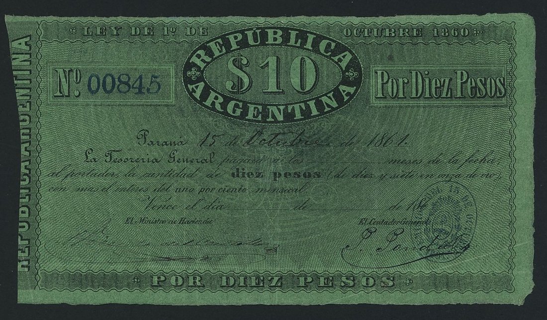 Republica Argentina, 10 Pesos, 15th October 1861, serial number 00845, (Pick S220), very fine, scarce