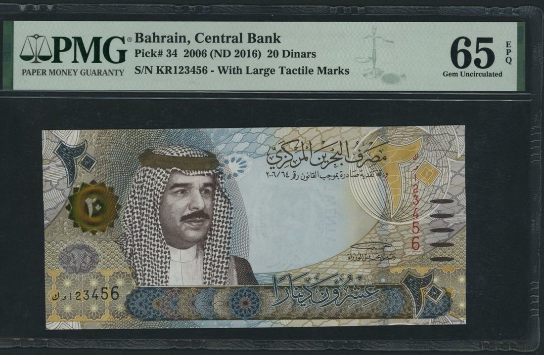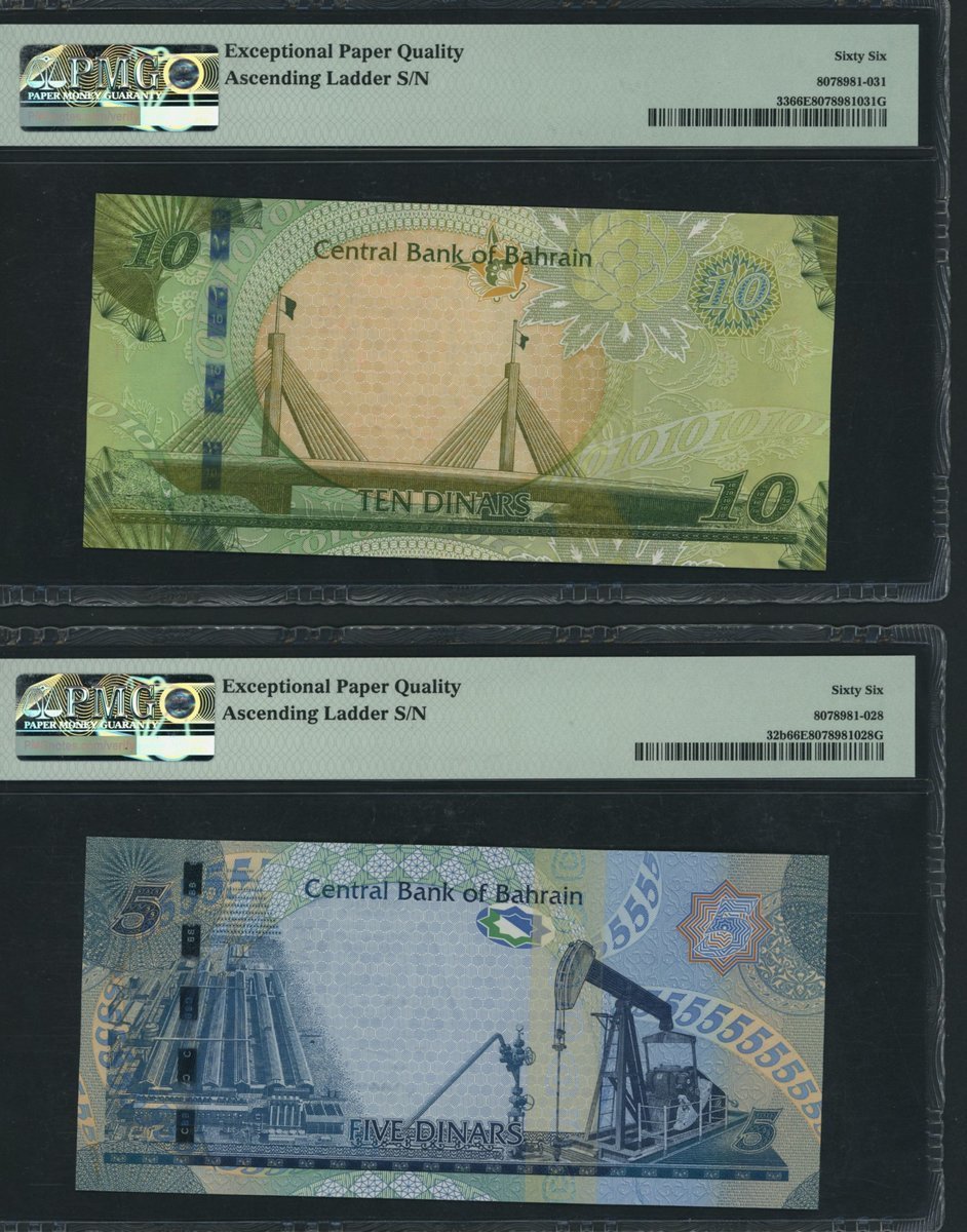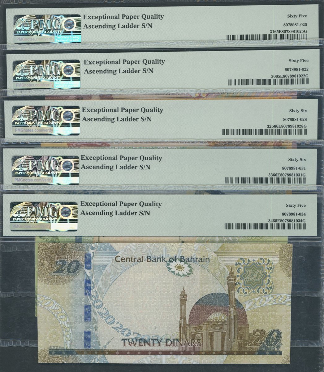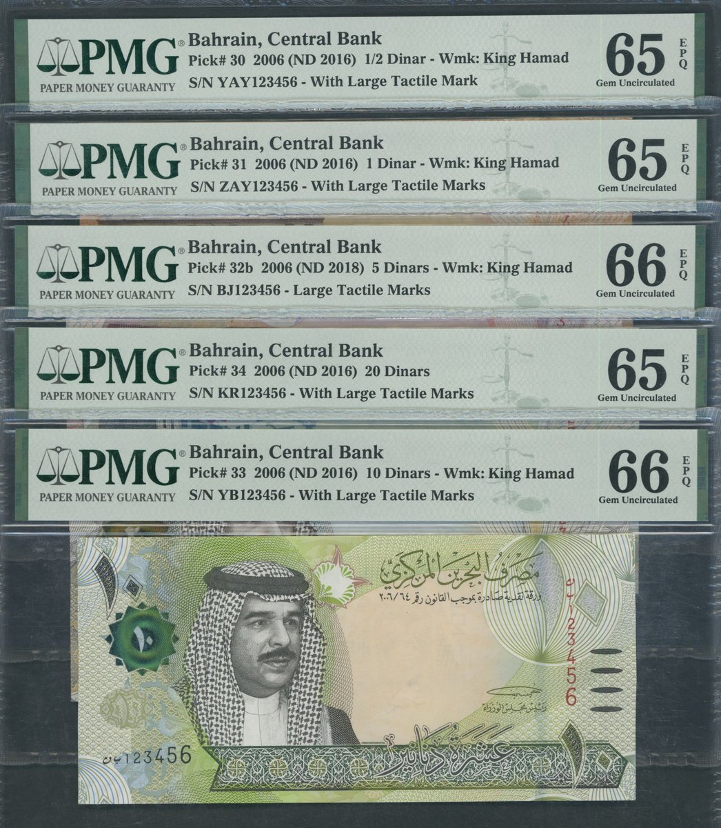 Central Bank of Bahrain, [5 notes] a complete set of 1/2, 1, 5, 10, 20 Dinars, ND (2016-18), with matching ascending ladder serial numbers 123456,