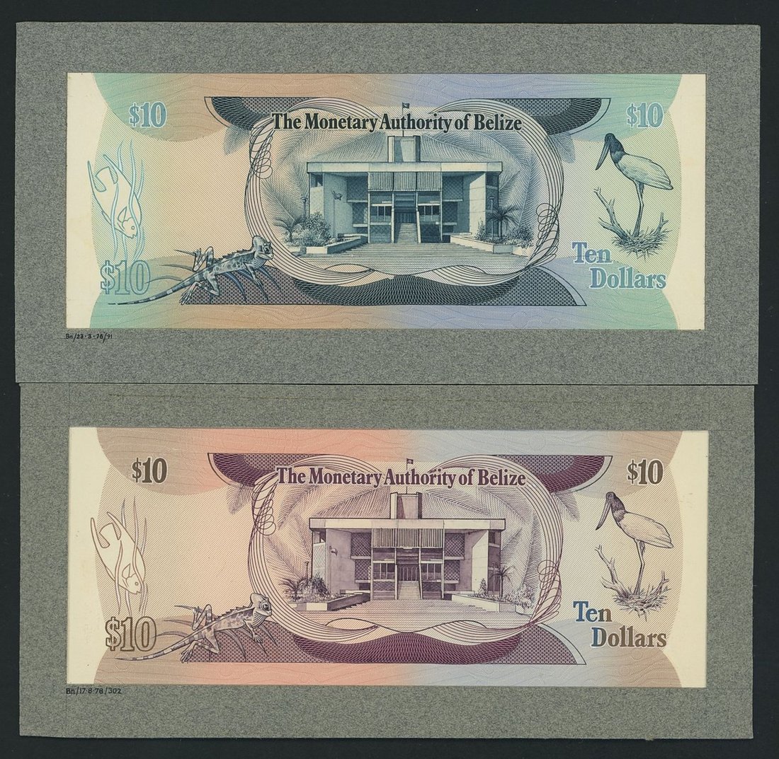 Monetary Authority of Belize, [2 notes] pair of back composite essays for $10, 1978, issued and unissued colour varieties, one violet overprint (issued), the other blue (unissued),