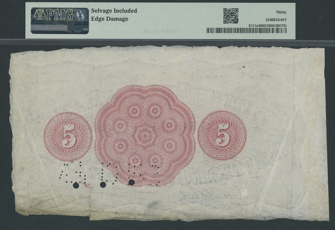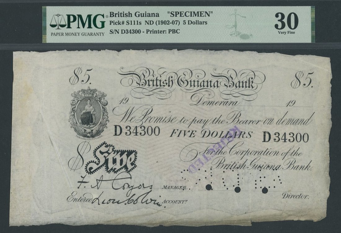 British Guiana Bank, *TOP POP* specimen 5 Dollars, ND (ca. 1902-07), serial number D34300, (Pick S111s), in PMG holder 30 Very Fine, selvage included, edge damage, the sole banknote of this type graded by PMG