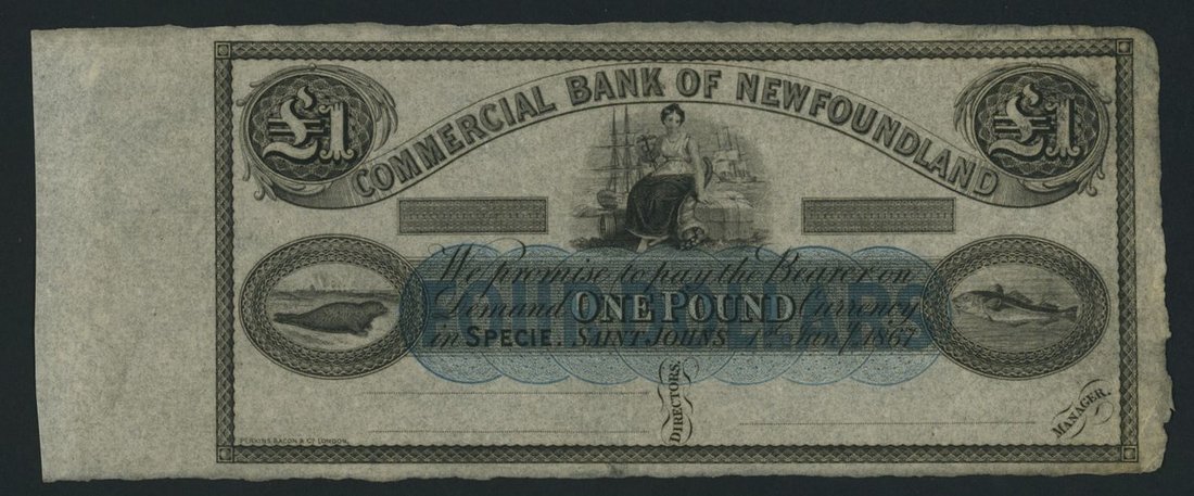 Commercial Bank of Newfoundland, Canada, *TOP POP* remainder £1 ($4), St. John's, 1st January 1867, with denomination in blue,