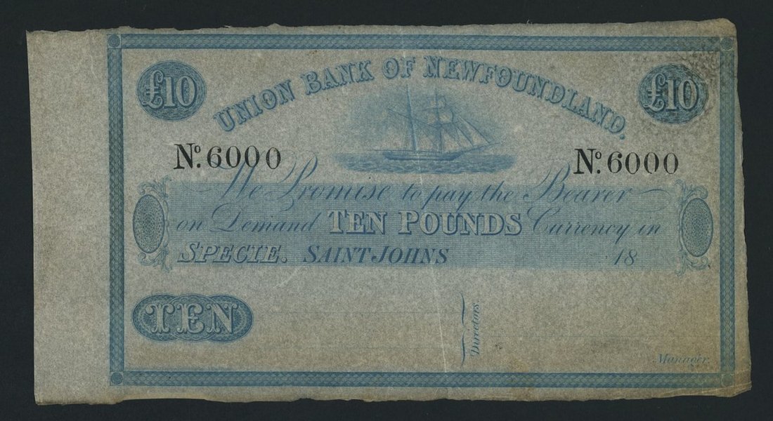 Union Bank of Newfoundland, Canada, *TOP POP* remainder £10, St. John's, 18-- (1854-55), serial number 6000, (Pick S120 (Newfoundland), Ch. # 750-10-60), in PMG holder 55 About Uncirculated, selvage included, stain, pinhole, the only note of its type graded on PMG census