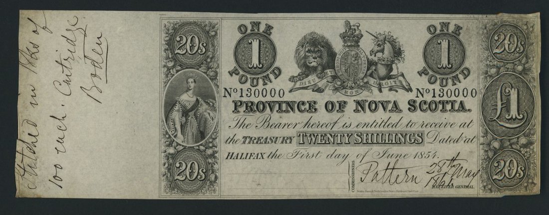 Province of Nova Scotia, Canada, *TOP POP* specimen £1 (20/- Shillings), Halifax, 1st June 1854, serial number 130000, (Pick S139, NS-22bS), in PMG holder 55 About Uncirculated, selvage included, printer's annotations, previously mounted, the only note of its type graded on PMG census