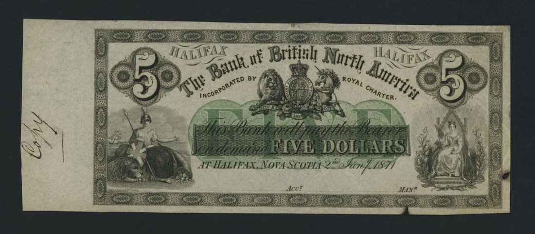 Bank of British North America, Canada, *TOP POP* remainder $5, Halifax, Nova Scotia, 2nd January 1871, with denomination in green,