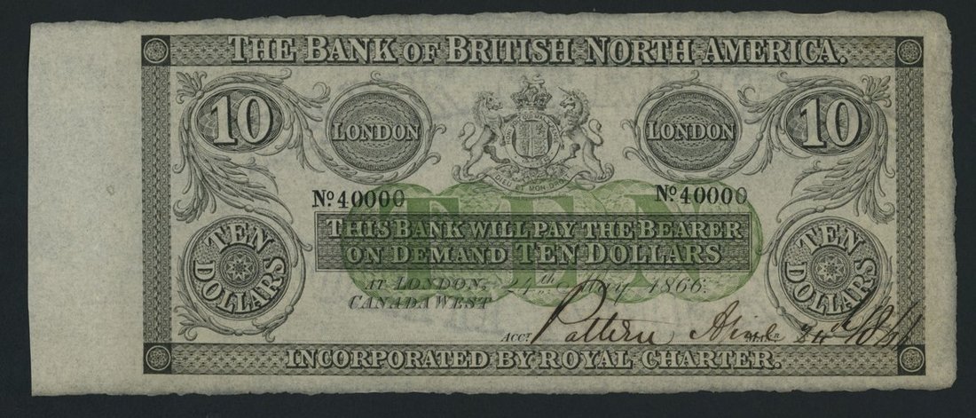 Bank of British North America, Canada, *TOP POP* remainder $10, London, Canada West, 24th May 1866, serial number 40000, with denomination in green,