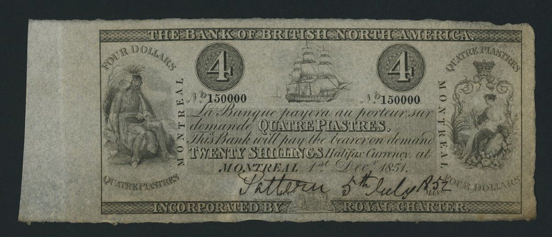 Bank of British North America, Canada, *TOP POP* specimen $4 (20/- Shillings), Montreal, 1st December 1851, serial number 150000, with denomination in green,