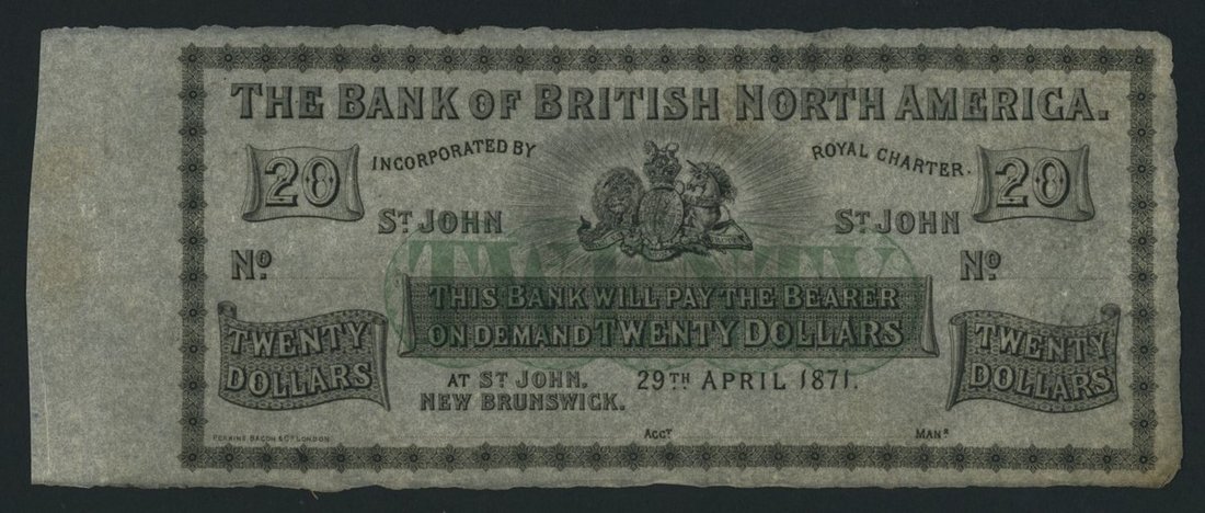Bank of British North America, Canada, *TOP POP* remainder $20, St. John, New Brunswick, 29th April 1871, with denomination in green,