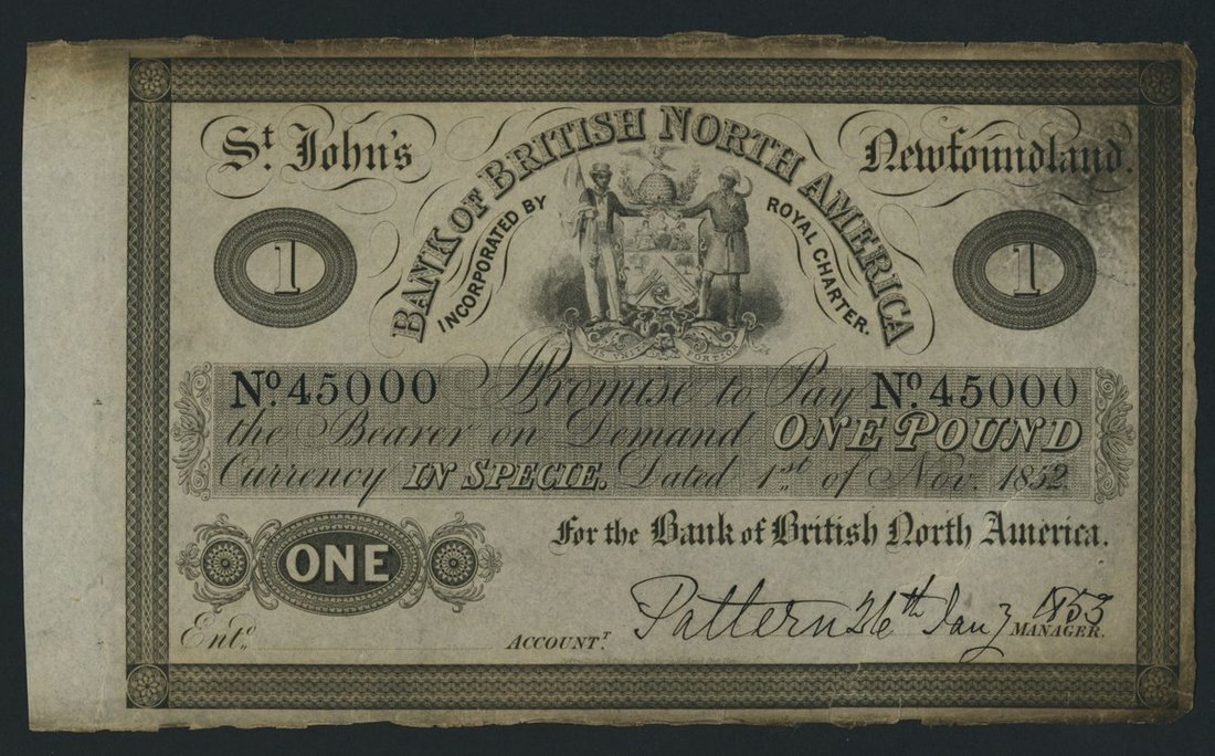 Bank of British North America, Canada, specimen £1, St. John's, Newfoundland, 1st November 1852, serial number 45000, (date unrecorded in SCWPM & Charlton, Pick S371 & Ch. # 55-10-10-02 for type), in PMG holder 40 NET Extremely Fine, selvage included, printer's annotation, corner reattached, tears, toning