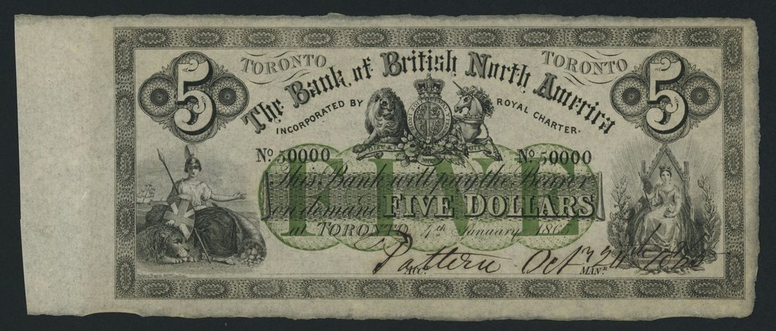 Bank of British North America, Canada, *TOP POP* specimen $5, Toronto, 4th January 1865, serial number 50000, with denomination in green,