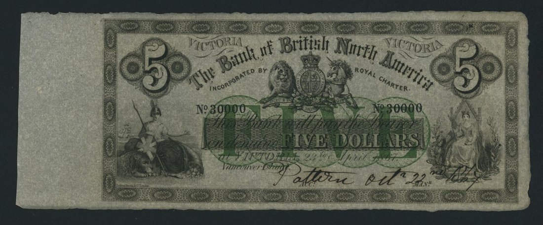 Bank of British North America, Canada, *TOP POP* specimen $5, Victoria, Vancouver Island, 23rd April 1867, serial number 30000, with denomination in green, and place of issue printed as "Vancouver Island" not "Vancouver's Island".