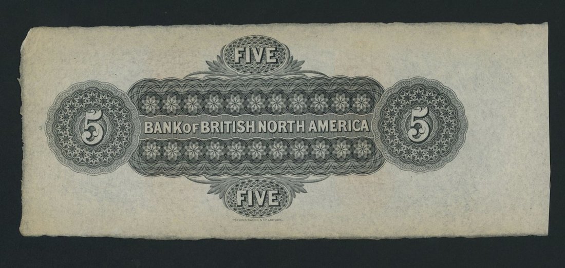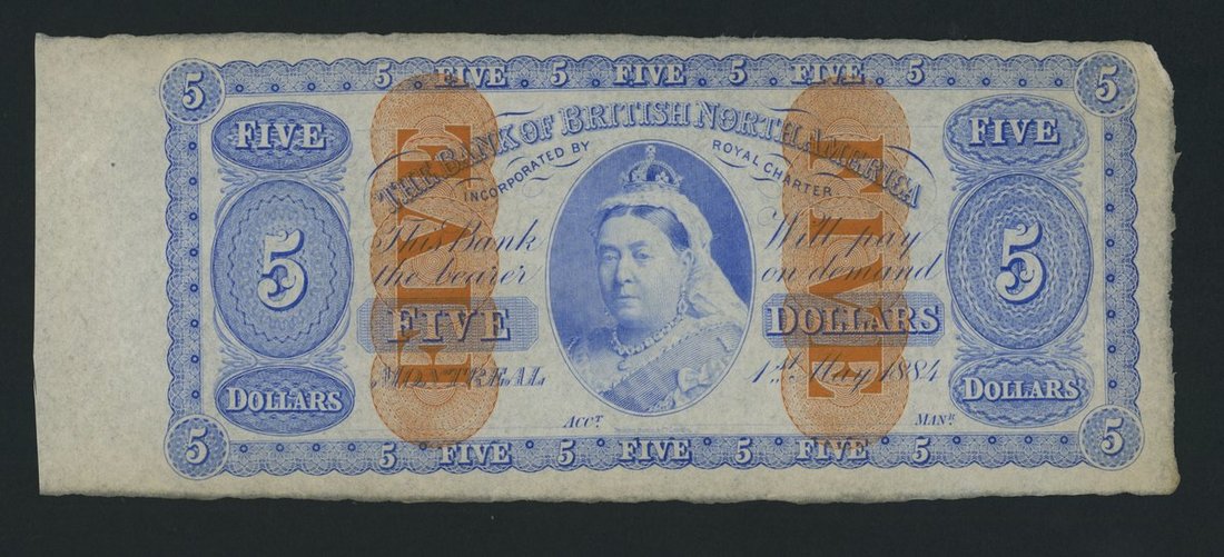 Bank of British North America, Canada, *TOP POP* remainder $5, Montreal, 1st May 1884, portrait of Queen Victoria with denomination in orange,
