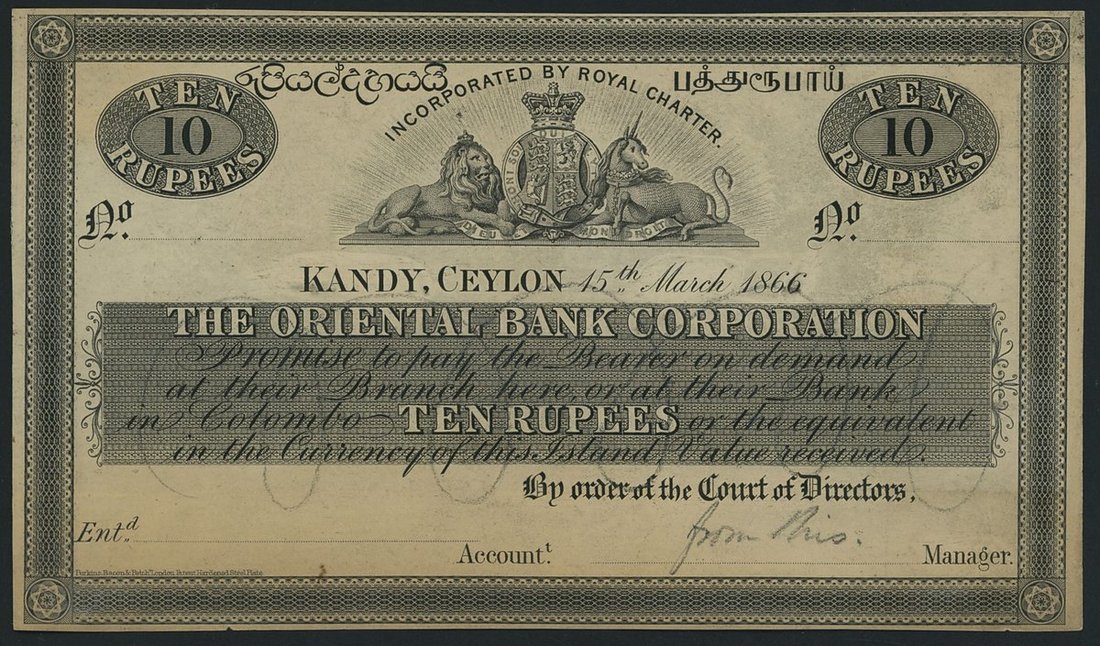 Oriental Bank Corporation, Ceylon, Kandy, proof 10 Rupees, 15th March 1866, (Pick Unlisted), extremely fine, previously mounted, with a couple of minor marks and a small <1mm nick into the lower margin, a rare and exceptional Kandy note in the unrecorded 10 Rupees denomination