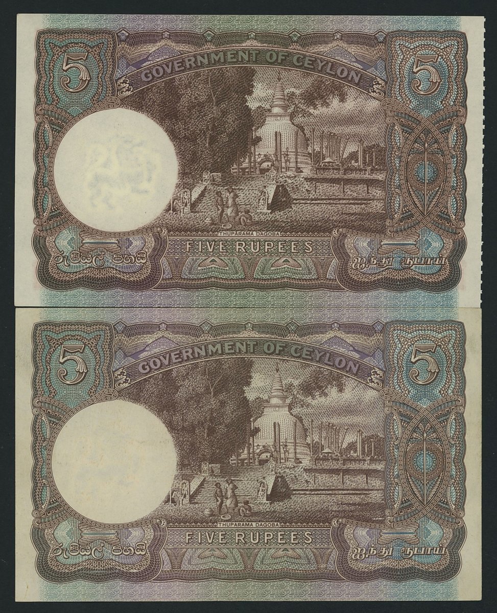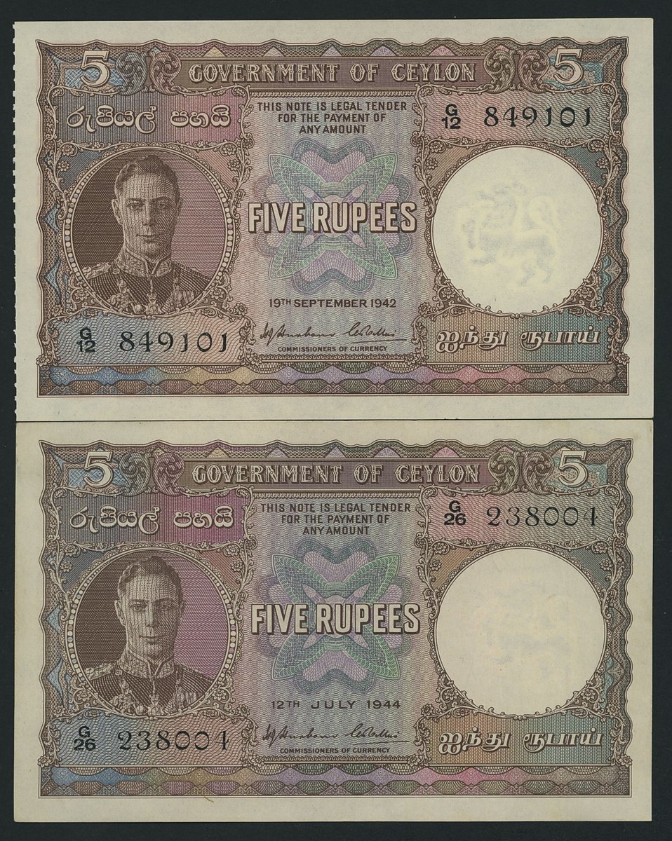 Government of Ceylon, [2 notes] 5 Rupees, 1942-44, (Pick 36), extremely fine to about uncirculated (2 notes)