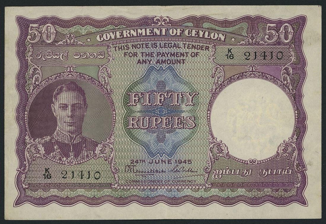 Government of Ceylon, 50 Rupees, 24th June 1945, serial number K/16 21410, (Pick 37a), very fine, an exceptional example of this rare issue